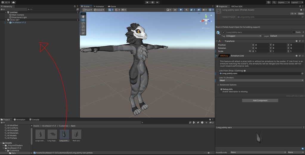 I used vrcfury to add an armature linking component to the prefab, so now the ears will parent automatically to the head bone when you drag and drop it into the hierarchy. This keeps the customisation process super simple. It is the same process for the tail, and future clothing assets I have planned.