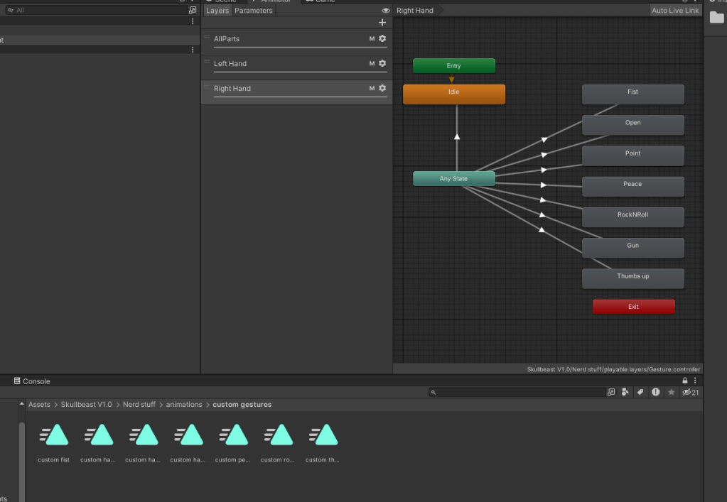 Using a gesture layer template in the VRChat SDK, I created an animator layer which controls the way your fingers move when hitting certain buttons on your VR controller. I also made new animation files which contained keyframes for each different hand gesture