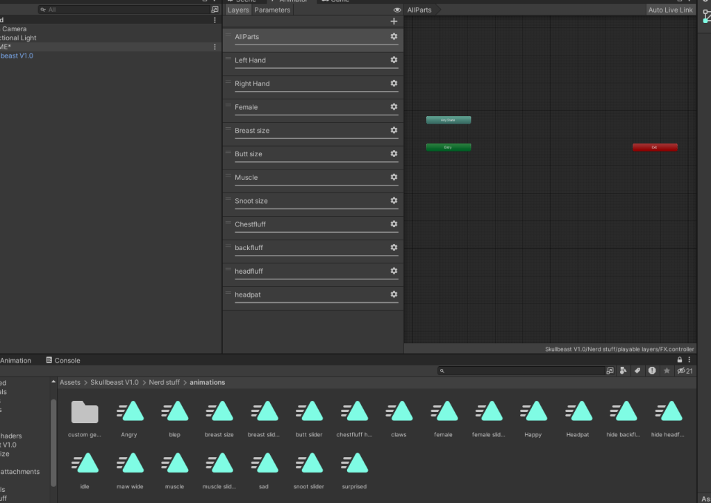 I next created the FX layer, which is used for more unique animations, such as radial shapekey animations, facial gestures, contact receivers and toggles.