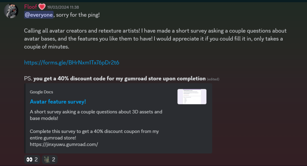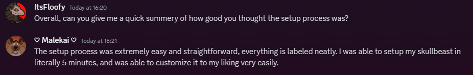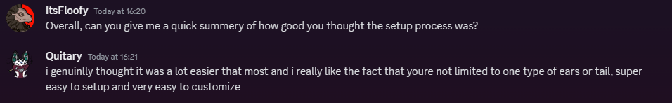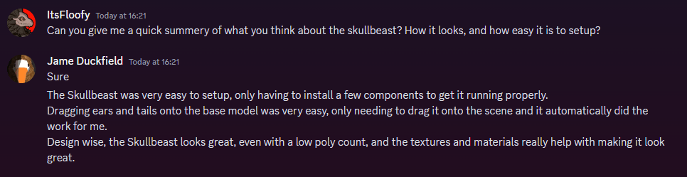As I was rendering, and taking pictures of the finished project, I sent the files to a couple friends in my discord server and asked for their advice on how easy the setup is, and what they think of the finished avatar.
