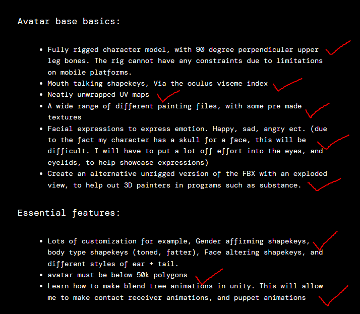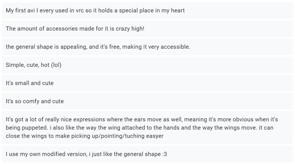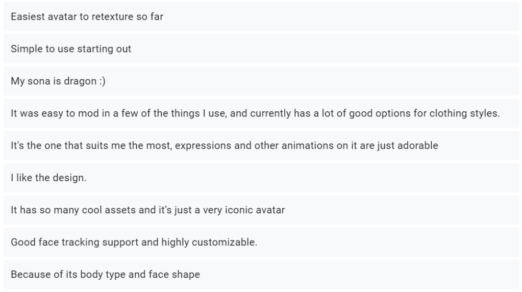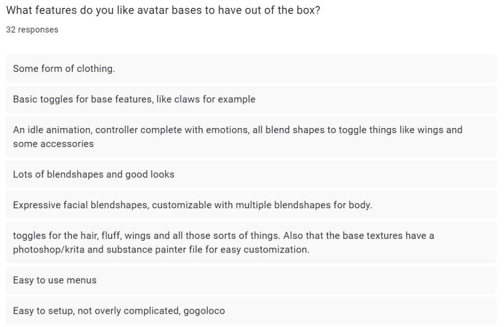 All 3 responses mentioned the easy setup, which was one of the main objectives I had set myself. This shows that my target audience was satisfied with the final product. I will also be releasing this avatar base to the public, with hopefully a few additional clothing bundles. I will be able to get a deeper look into my target audience and their opinions on it, once people start using this thing on a wider scale.