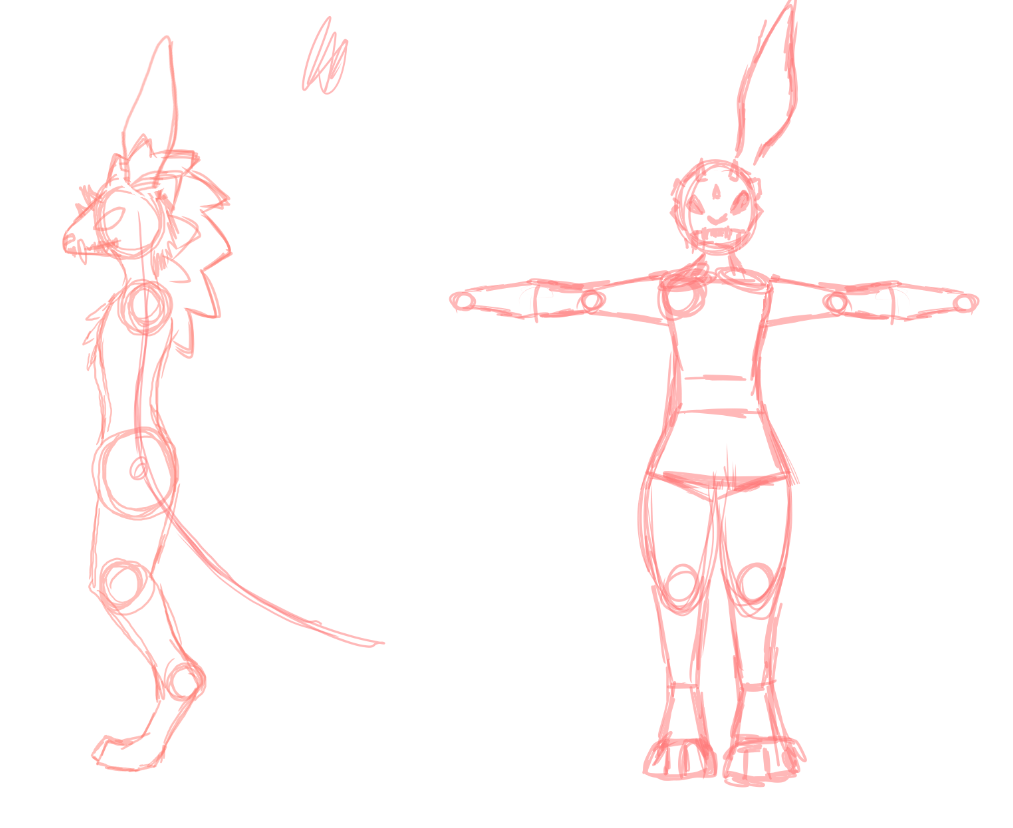 To help me with modelling, I need to draw a turnaround sheet, with all the proportions of my model roughly sketched out, from a front and side view. This will help getting my desired look translated into 3D a lot easier.