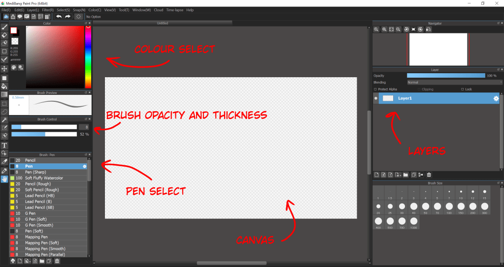 For this drawing I’m going to be using Medibang paint pro, and a drawing tablet. Whilst Medibang isn’t Industry standard like photoshop is for concept art, it is still a very powerful free little piece of software, and is very easy to use. It will make sketching out these drawings much easier. Here is a quick overview of the UI, and what tools I will be using for these projects: