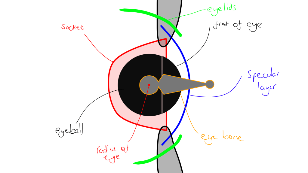 This blends the skull properly to the main body, without it looking like its just been stuck onto it. I also decided to do the eyes next. Due to the fact this avatar doesn’t really have a typically face, I would need to think outside of the box when it comes to eyes. I wanted them to look 3D, and they needed to have the ability to rotate using an eye bone. I created this plan to make sure that the eyes keep a full 3D effect, and doesn’t just look like a floating ball inside the socket.