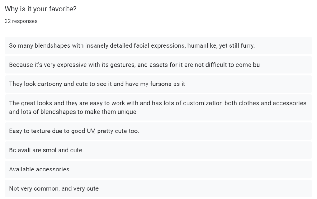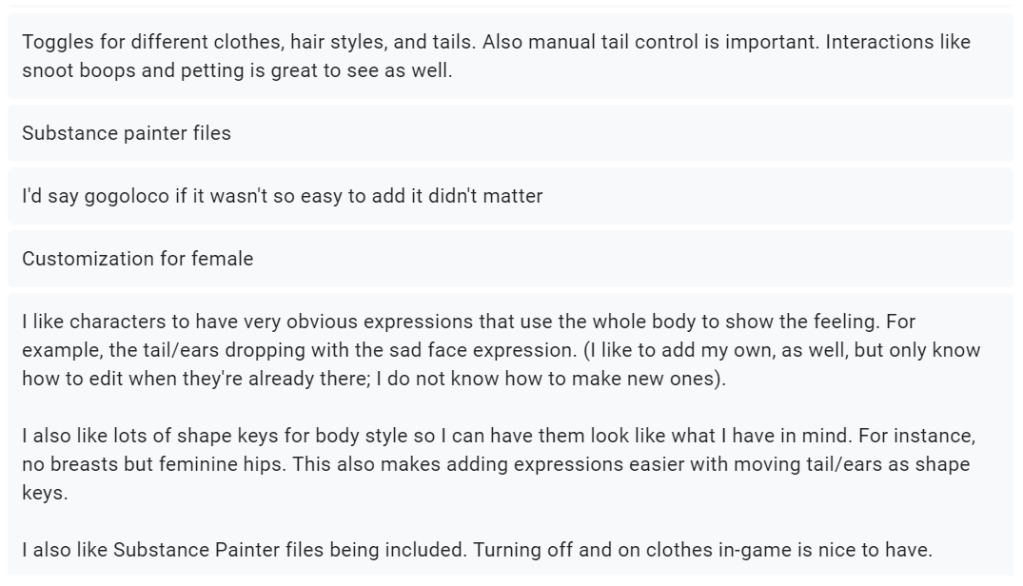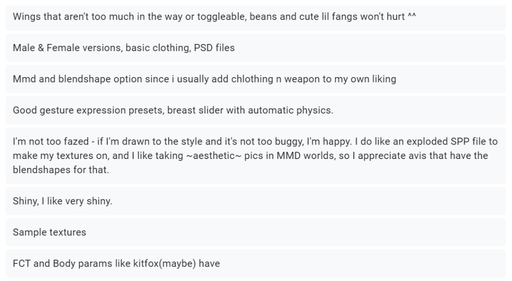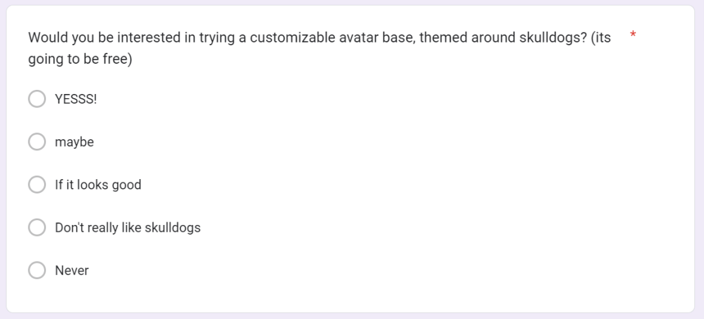 I’m going to need a lot of information about what features my target audience wants, so that I can make a product that people would want to download/buy. I decided to put together a bunch of questions that would help me understand why people like certain avatars.