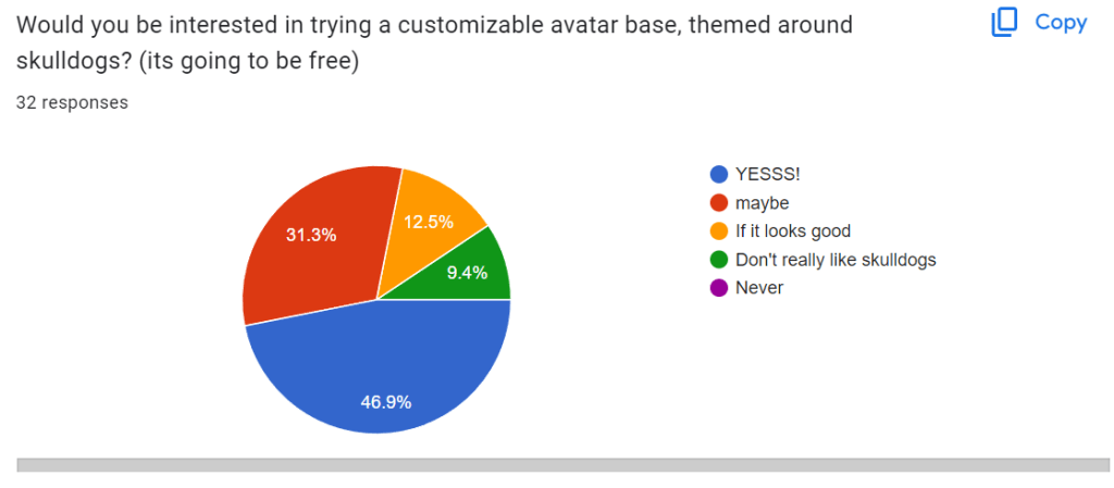 From the research I did, I came to conclusion that the avatar base idea is the best. Not only is it the idea I resonate with the most, over 80 percent of people who answered by survey said that they don’t use their real face online, and use either something else, such as anime profile pictures, or original characters to present themselves online. This proves that there is a market for this type of product.