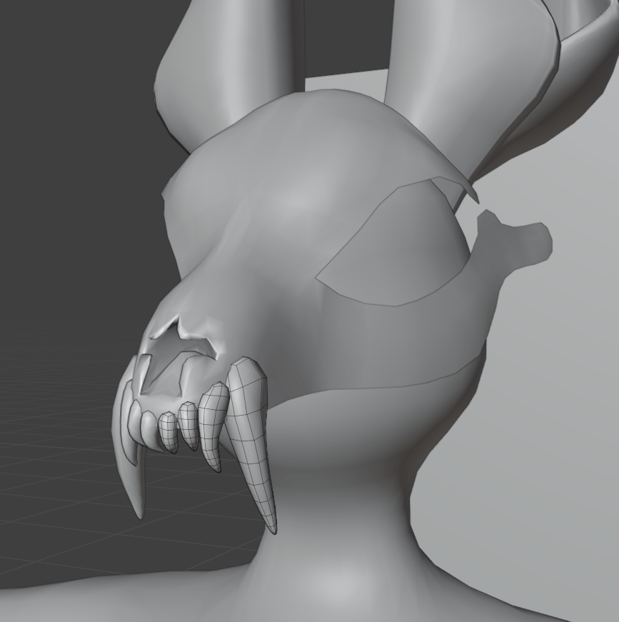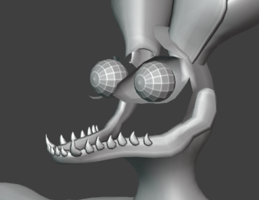 Next I started working on the teeth. These were relatively simple, and yet another case of me adding a cube, extruding to a rough shape, and subdividing. I thought by doing the top row of teeth, it would make modelling the lower jaw in the correct place a bit easier, instead of putting them too close together.