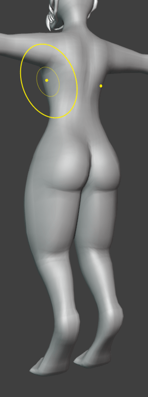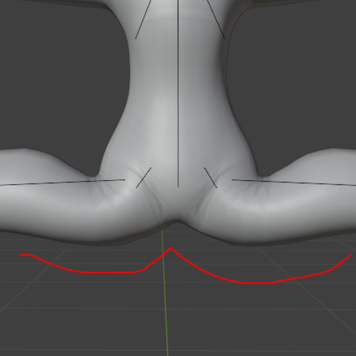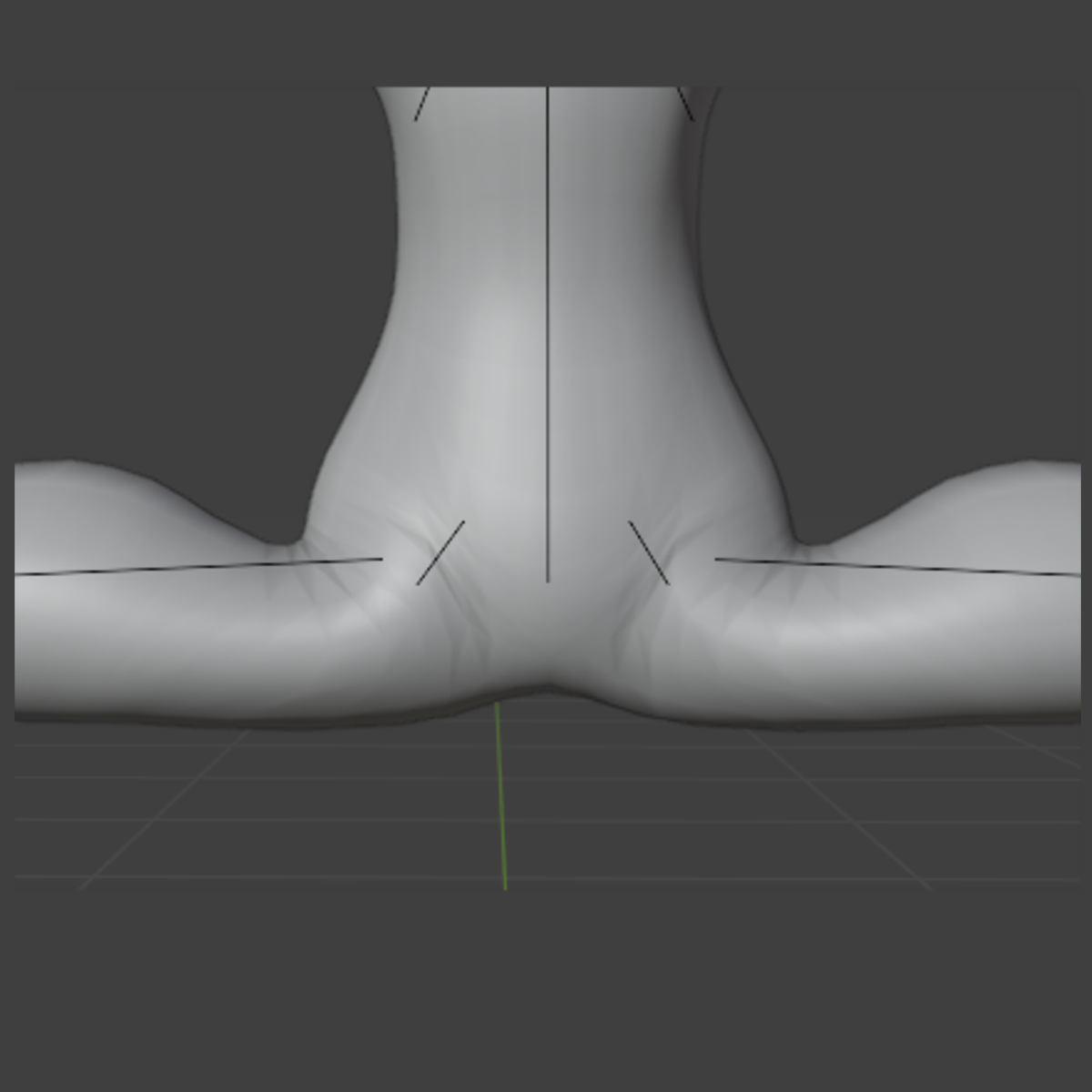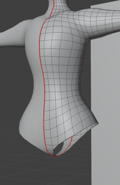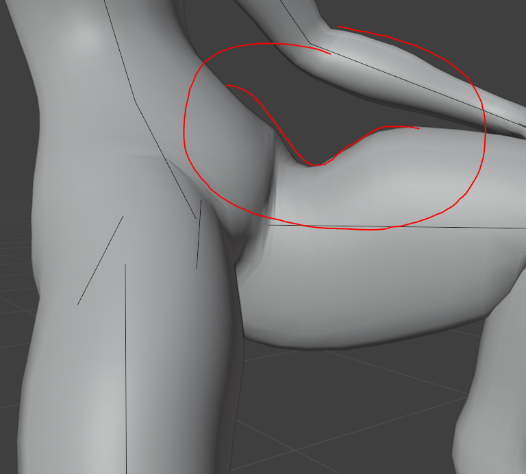 At this point, I was starting to touch up the rough shape of the chest with the sculpting tools, defining areas around the collarbones, smoothing out more jagged parts of the extrusions, and edge loop cutting areas which are going to be deforming a lot, such as elbows, the crotch area, and around the shoulders and armpits. I also used sculpting to define the back of the thighs, shoulder blades, and the buttocks. The buttocks are actually quite an important thing to define on a base that will be using large tails, you need to have a smooth shape that makes sense, otherwise it will look like the tail is just superglued on. You need to have a smooth curve, as shown in my drawing, and the back of the thighs kind of add to that curve.