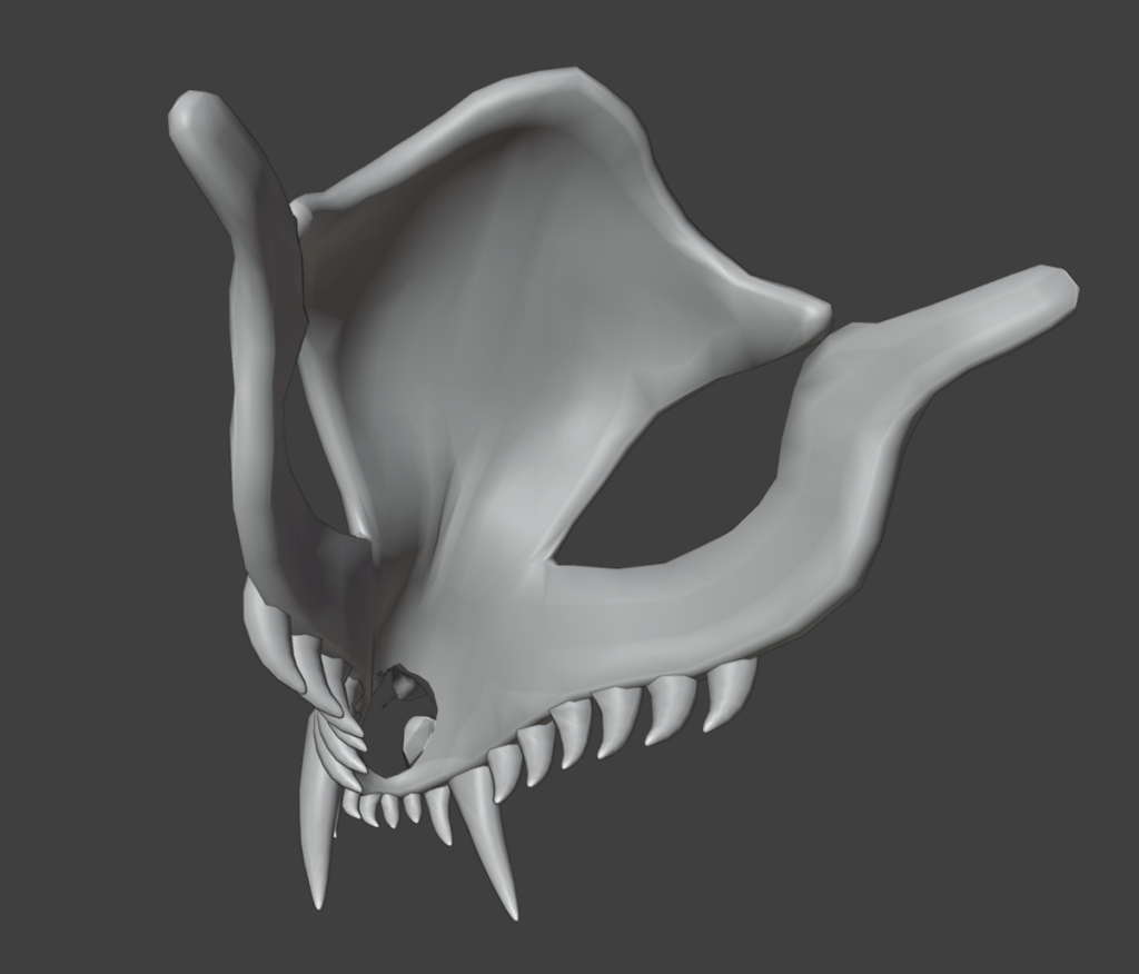 For the lower jaw, I used a similar method to get the rough shape. I started off with a singular vertex, filled it all in trying to keep quad topology, used the solidify modifier, and added an edge loop around the edges. This was a much faster process as the shape was not quite as complicated.