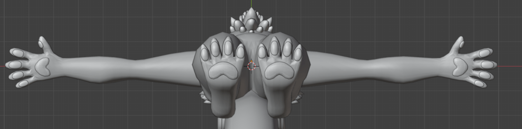 To model the paw pads, I duplicated the bits of mesh I had edited on the hand topology, subdivided them, and used the sculpt tools to adjust the shame and smooth them out a bit. I also made sure the first edge loop was clipping inside the hand, so they didn’t look like they were floating. I did a similar process to model the paw pads on the feet.