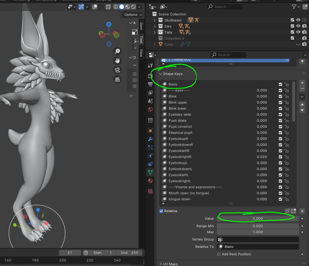 I used the same feature for the blinking, however now the majority of the modelling is done now, so I can start doing the rest of them. This includes things likes the oculus viseme index, facial expressions, body shape customization ect. Shapekeys are actually very easy to make, you just press the little add icon to get yourself a basis, and then start adding all the options you are going to have. To sculpt what the shapekey is going to do, change the value to one, and then make all the changes to the mesh that u want. By moving that slider up and down, it will slowly shift between the basis shape, and the new edited shape.