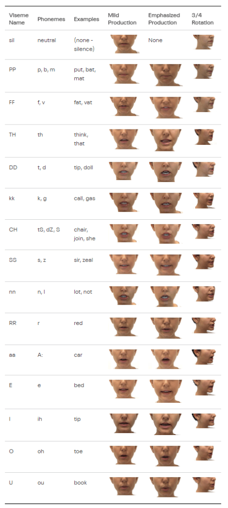 Oculus. Viseme Reference. [Online]. Oculus developer. Last Updated: (unknown) Available at: https://developer.oculus.com/documentation/unity/audio-ovrlipsync-viseme-reference/?locale=en_GB [Accessed 1 April 2024].
