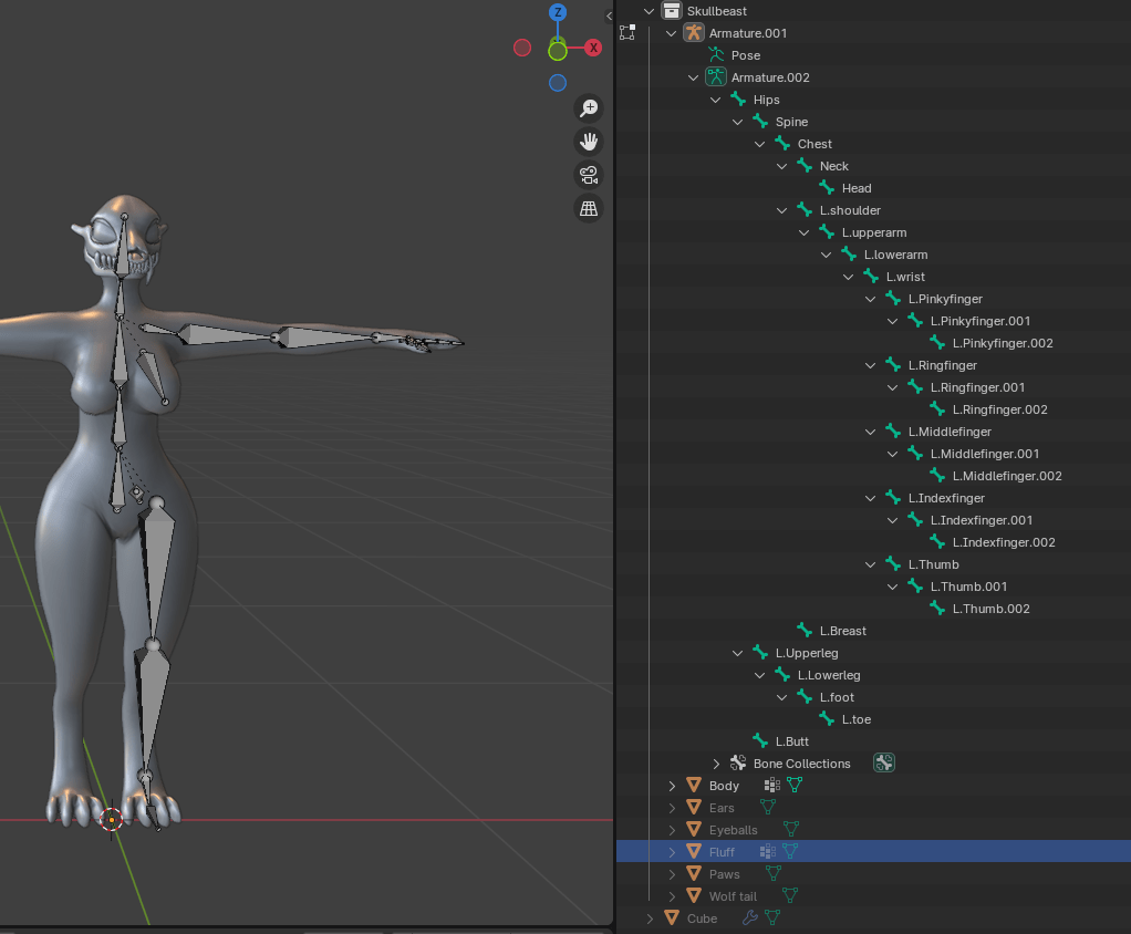 Now the modelling and shapekeys are done it was time to do the rig, first of all, I need to rig the base body, without any of the fluff and paws pads. I can transfer the weights to them after weight painting the base mesh.