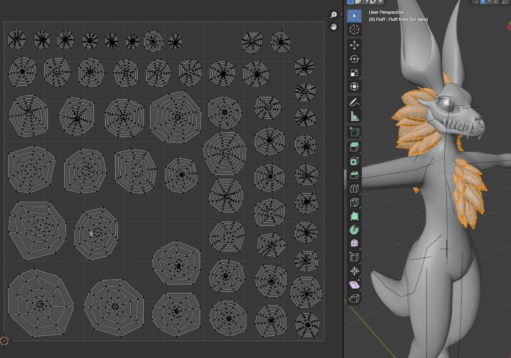 The fluff was not so easy to unwrap. I basically had to sort out these cobweb shapes by hand, as the unwrap tool was not doing a very accurate job. I would have saved myself a lot of time if i had UV unwrapped the fluff before duplicating the mesh and modelling the fluff. This would mean that all the fluff UVs would be unwrapped and identical. All I would have had to have done is move them all to their own spot so they aren’t overlapping.