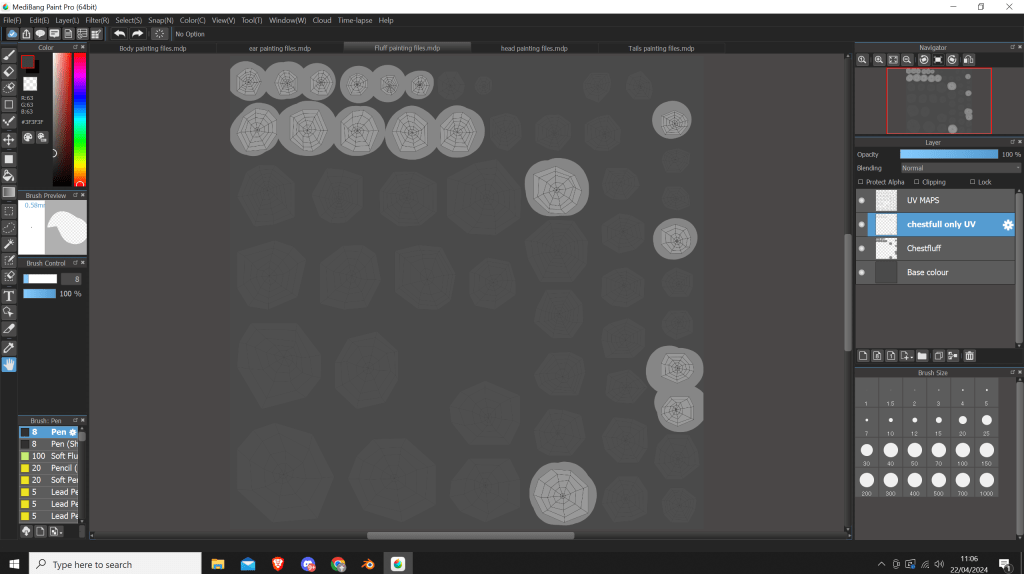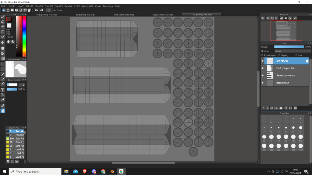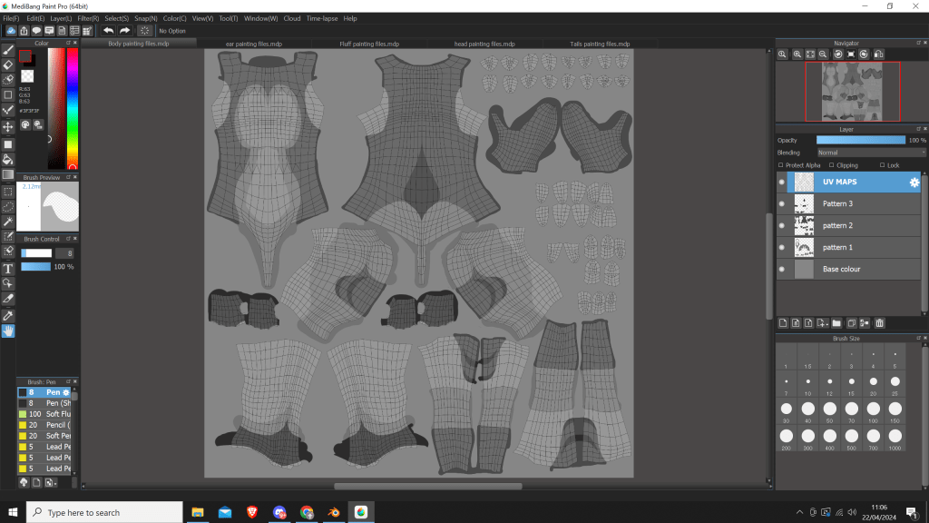 Once the UVs were done, I started painting some patterns, and created some files in medibang paint pro. Whilst medibang isn’t the most popular too as I mentioned earlier when I did my reference drawingsl, It can export its final files to PSD, which is very important for my project. This gives anyone who wishes to paint in 2D the ability to paint in any painting program they want, so long as it supports PSD files.