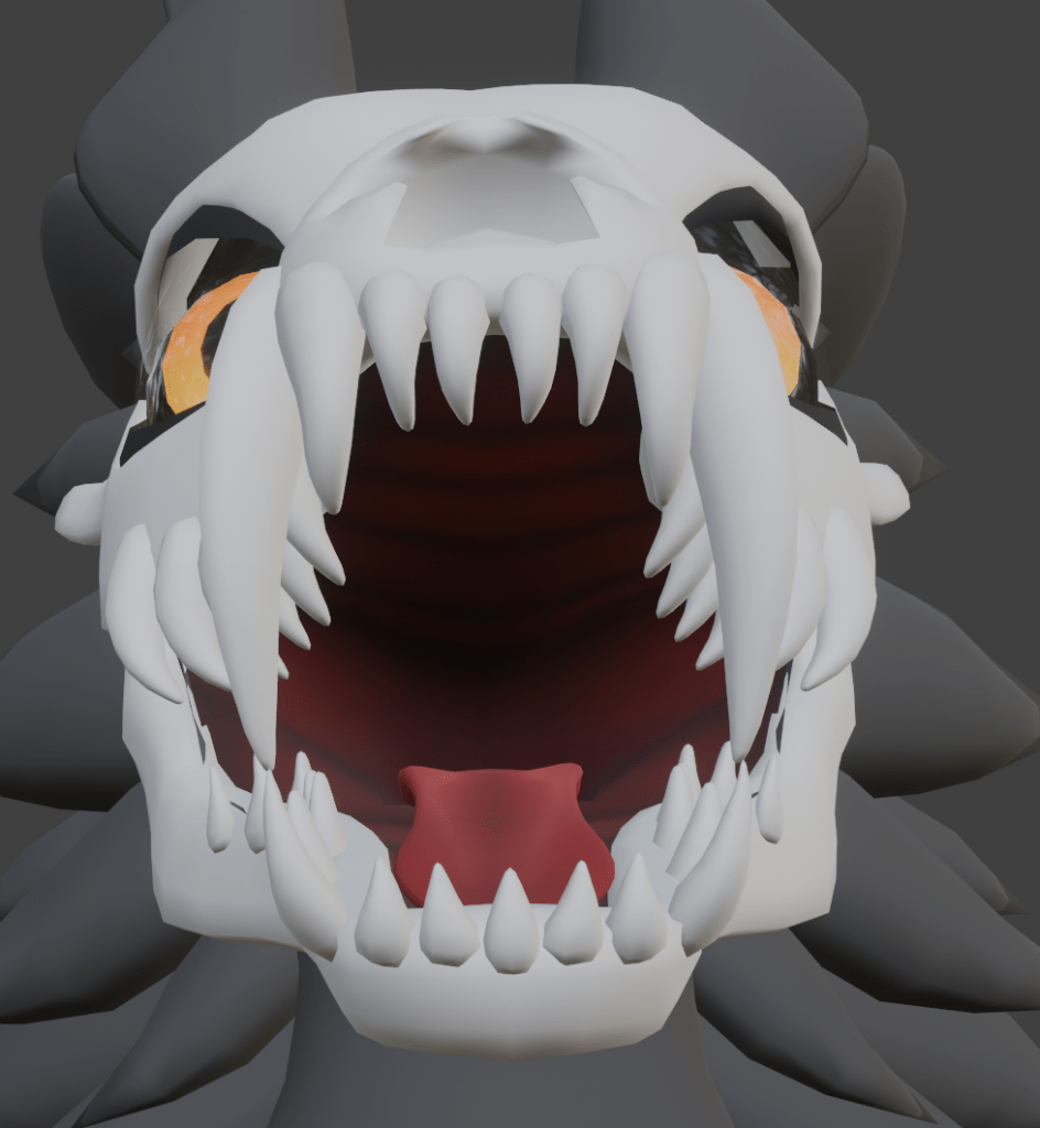 I also started working on the ‘Mouth bag’. These are typically small bags with inverted normals, which give a more 3D effect to the mouth of a character when it talks/opens its mouth. This avatar has a very large face, and you can see through the majority of the skull as it doesn’t have skin forming a mouth, So I needed to make something a bit more elaborate and detailed to keep that illusion, and to stop people seeing inside the face mesh.