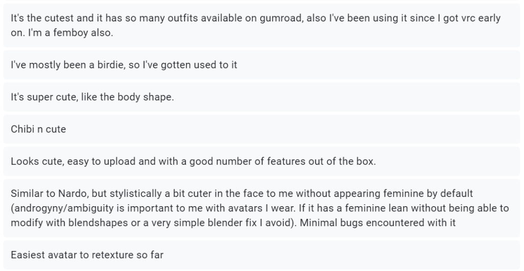 I also love how expressive this avatar base is, there is so much emotion behind so many of those shapekeys, it easily allows people to show real life emotions, and express themselves fully through this avatar.