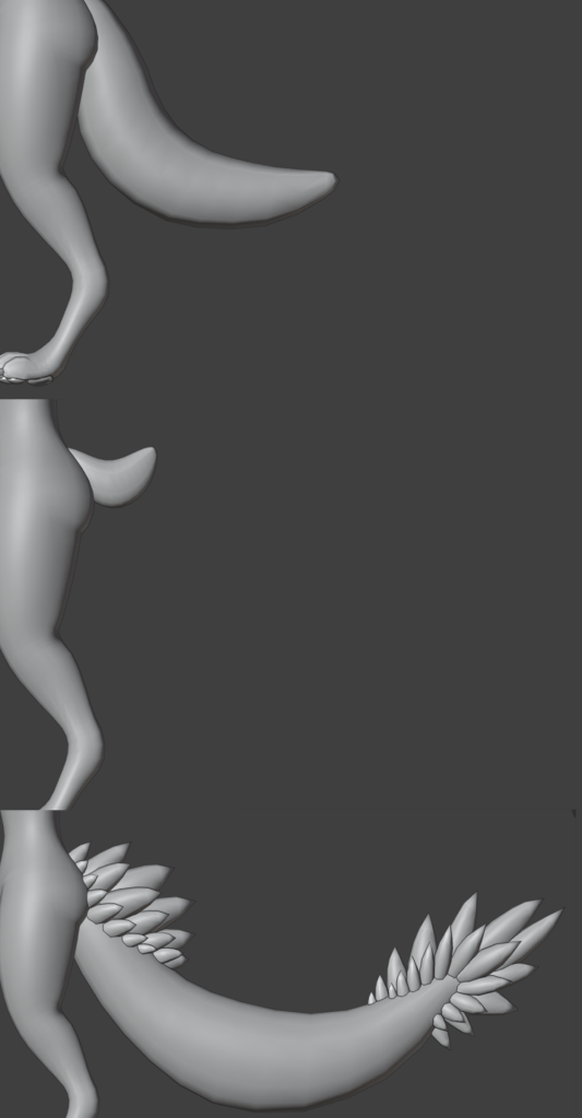 I did a standard wolf tail shape for the default tail. This is a good neutral starting point. I also did a little nub tail, as I thought this avatar base would look super cool with some antlers and other deer features. Finally I did an over the top tail, with lots of fluff. This is for people who want to make a statement, and be more beast/dragon like.